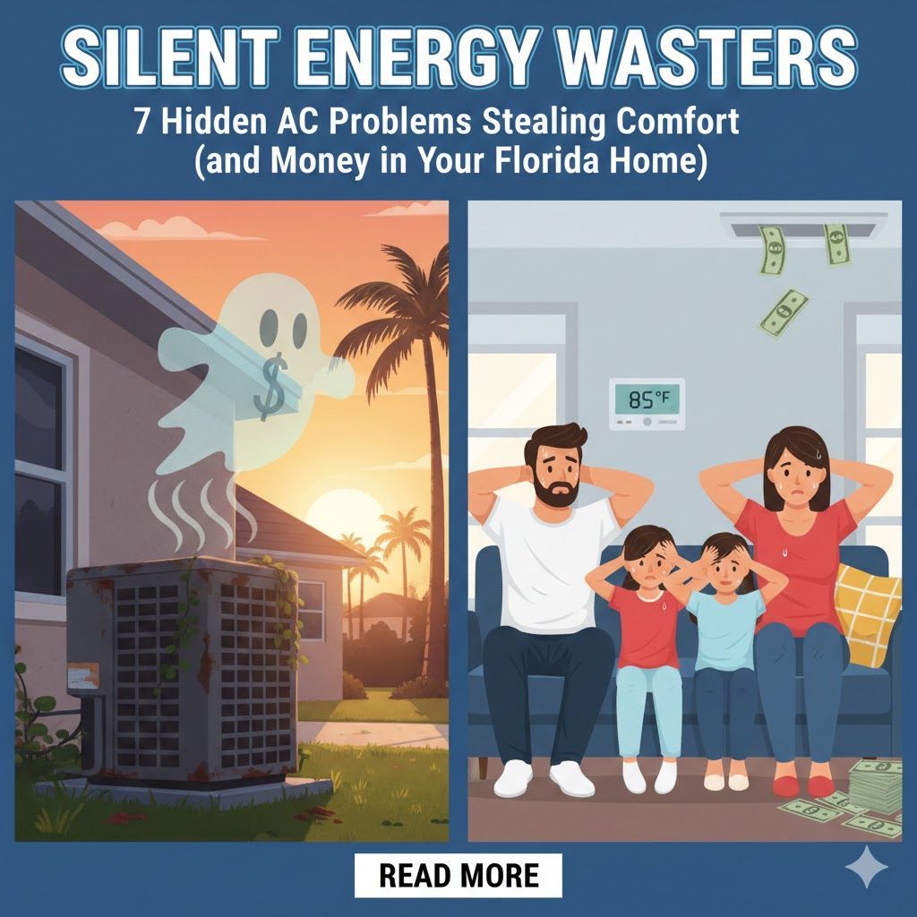 If your Florida home feels warm, sticky, or unevenly cooled even though your AC “runs all the time,” there is a good chance your system has hidden problems quietly draining energy and comfort. These issues don’t always cause an obvious breakdown, but they can add up to higher power bills, shorter equipment life, and rooms that never feel quite right. In a hot, humid climate like Florida’s, tracking down and fixing these “silent energy wasters” is one of the fastest ways to improve comfort and control costs. Below is a homeowner-friendly guide to seven of the most common hidden AC problems in Florida homes, what to look for, and how a professional inspection can help you stop wasting money without sacrificing comfort. 1. Leaky, Poorly Insulated Ductwork One of the biggest hidden energy leaks in Florida homes is the ductwork you never see. In many houses, supply and return ducts run through hot attics or tight chases where gaps, loose connections, and failing tape can quietly leak away a large portion of your cooled air. Even small leaks add up when your AC runs almost year-round. When conditioned air escapes into the attic, the system must run longer to reach the thermostat setting, which drives up electric bills and puts extra wear on the compressor and blower motor. At the same time, return leaks can pull in hot, humid attic air, making the system work harder and leaving rooms muggy and uncomfortable. Common signs of duct problems include rooms that never quite reach the set temperature, weak airflow from certain vents, and dust streaks around duct joints or registers. A professional HVAC technician can test for duct leakage, re-seal joints with mastic rather than tape, and recommend better insulation for ducts in unconditioned spaces. Properly sealed and insulated ducts increase delivered airflow, improve comfort in farthest rooms, and can translate into noticeable energy savings over the course of a long Florida cooling season. 2. Oversized Systems That Short-Cycle Many Florida homes have AC systems that are too large for the actual cooling load of the house. Oversizing may sound like a good idea—more capacity means more cooling, right?—but in practice, a system that is “too big” can be one of the most uncomfortable and inefficient setups you can have. An oversized AC unit tends to short-cycle, meaning it turns on, drops the temperature quickly near the thermostat, and then shuts off before it can fully dehumidify the air in the home. You end up with rooms that feel cold and clammy rather than cool and dry. Short cycling also causes more frequent starts and stops, which are the most stressful moments for the compressor and electrical components. Over time, that extra stress can shorten system life and increase the odds of breakdowns during peak heat. If your system rarely runs for more than a few minutes at a time, if your home feels sticky even when the thermostat number looks fine, or if you suffer from big temperature swings, an AC that is too large may be part of the problem. A qualified contractor can perform a proper load calculation instead of guessing based on square footage alone, then recommend right-sized equipment, staging options, or variable-speed systems that provide longer, gentler cycles that better control humidity and reduce energy waste. 3. Hidden Airflow Restrictions in Returns and Vents Your air conditioner is only as good as the airflow moving through it. Even if the equipment is in perfect mechanical condition, hidden restrictions in return air paths and supply vents can quietly rob your system of performance. Common trouble spots include undersized return grilles, blocked returns behind furniture, closed doors that prevent air from circulating, and supply vents covered by rugs, curtains, or large pieces of furniture. When the system cannot pull enough air across the evaporator coil, coil temperature can drop too low, encouraging icing and reducing the system’s ability to remove heat and humidity from the air. Restricted airflow also increases static pressure in the duct system, forcing the blower motor to work harder for less result. That extra strain can show up as higher energy use, noisy operation, and uneven temperatures from room to room. Homeowners can start by making sure every return grille is unobstructed and that supply vents are fully open and not covered or blocked. In some homes, additional or larger returns may be needed to relieve airflow bottlenecks. During a professional assessment, a technician can measure static pressure, check duct sizes, and identify where the system is “choking,” then propose changes that improve airflow, efficiency, and overall comfort throughout your Florida home. 4. Dirty Coils and Hidden Indoor Contamination Most homeowners know to check or change the air filter, but many never think about what’s happening deeper inside the indoor unit. Over time, dust, dander, and biological growth can accumulate on the evaporator coil and blower wheel, especially in a humid climate where moisture is present on these components for much of the cooling season. That thin, grimy layer acts like insulation, making it harder for the coil to absorb heat and moisture from the air. A dirty coil leads to several problems at once: reduced cooling capacity, higher energy use, poor dehumidification, and increased risk of icing on the refrigerant lines. The blower wheel can also become caked with debris, reducing its ability to move air and creating balance issues that cause noise and extra wear on the motor. Even if the filter is replaced regularly, a system that has gone years without professional cleaning may be laboring under this hidden buildup. Because the evaporator coil and blower are sealed behind panels, these areas are not easily visible to homeowners. A comprehensive maintenance visit includes opening the air handler, inspecting internal components, and cleaning coils and blower assemblies with appropriate 